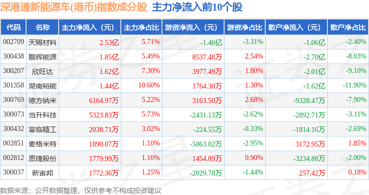 资金流向方面,深港通新能源车(港币)(983088)指数成份股当日主力资金净流出合计19.56亿元,游资资金净流入合计3.71亿元,散户资金净流入合计15.85亿元。成份股资金流向详情见下表: