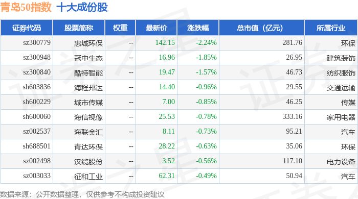 证券之星消息,11月27日,青岛50(989011)指数报收于2371.16点,涨0.17%,成交65.83亿元,换手率1.18%。当日该指数成份股中,上涨的有21家,高测股份以4.93%的涨幅领涨,下跌的有15家,惠城环保以2.24%的跌幅领跌。