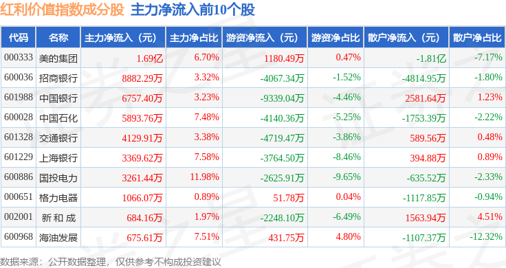 资金流向方面,红利价值(989016)指数成份股当日主力资金净流出合计1.08亿元,游资资金净流入合计9958.29万元,散户资金净流入合计838.29万元。成份股资金流向详情见下表: