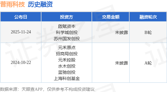 证券之星消息,根据天眼查APP于11月24日公布的信息整理,普雨科技(苏州)有限公司B轮融资,融资额未披露,参与投资的机构包括啟赋资本,科学城创投,苏州国发创投。