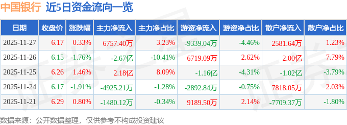 证券之星消息,截至2025年11月27日收盘,中国银行(601988)报收于6.17元,上涨0.33%,换手率0.16%,成交量342.02万手,成交额20.93亿元。