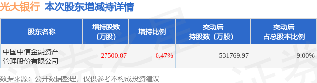 证券之星消息,11月27日光大银行发布公告《光大银行:中国光大银行股份有限公司关于股东权益变动触及1%刻度的提示性公告》,其股东中国中信金融资产管理股份有限公司于2025年7月24日至2025年11月27日间合计增持27500.07万股,占公司目前总股本的0.4654%,变动期间该股股价下跌13.92%,截止11月27日收盘报3.65元。