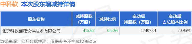 证券之星消息,11月27日中科软发布公告《中科软:中科软关于持股5%以上股东权益变动触及1%刻度的提示性公告》,其股东北京科软创源软件技术有限公司于2025年11月21日至2025年11月27日间合计减持415.63万股,占公司目前总股本的0.5001%,变动期间该股股价下跌3.23%,截止11月27日收盘报19.76元。