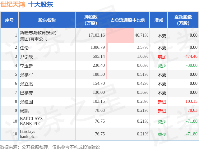 证券之星消息,11月27日世纪天鸿发布公告《世纪天鸿:关于控股股东及其一致行动人持股比例变动触及1%整数倍的提示性公告》,其股东新疆志鸿教育投资(集团)有限公司于2025年11月24日至2025年11月26日间合计减持463.05万股,占公司目前总股本的1.2647%,变动期间该股股价上涨2.37%,截止11月26日收盘报11.25元。
