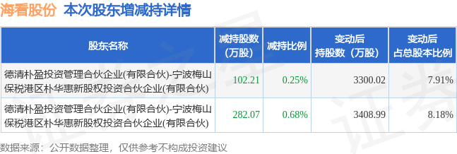 证券之星消息,11月27日海看股份发布公告《海看股份:关于持股5%以上股东权益变动触及1%整数倍的公告》,其股东德清朴盈投资管理合伙企业(有限合伙)-宁波梅山保税港区朴华惠新股权投资合伙企业(有限合伙)于2025年10月23日至2025年11月26日间合计减持384.28万股,占公司目前总股本的0.9215%,变动期间该股股价上涨20.17%,截止11月26日收盘报28.78元。