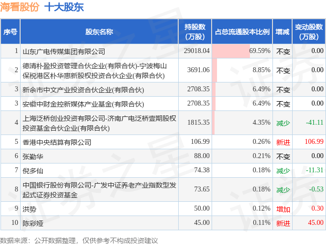 根据海看股份2025年三季报公布的十大股东详情如下: