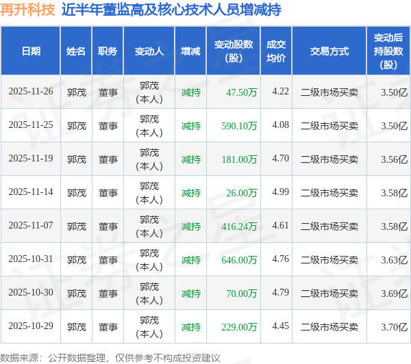 再升科技近半年内的董监高及核心技术人员增减持详情如下: