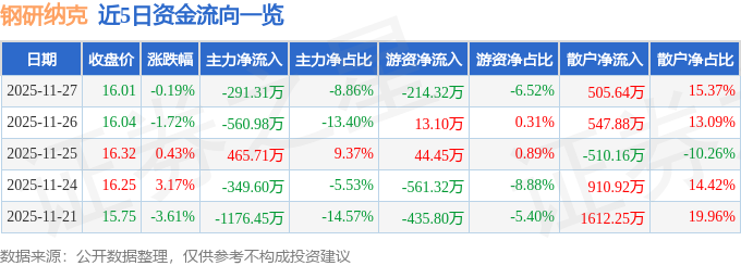 证券之星消息,截至2025年11月27日收盘,钢研纳克(300797)报收于16.01元,下跌0.19%,换手率0.54%,成交量2.04万手,成交额3289.7万元。