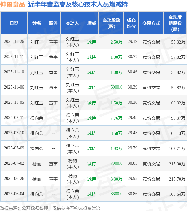 证券之星消息,根据11月27日市场公开信息、上市公司公告及交易所披露数据整理,仲景食品(300908)最新董监高及相关人员股份变动情况:2025年11月26日公司董事刘红玉共减持公司股份2.5万股,占公司总股本为0.0171%。变动期间公司股价上涨0.24%,11月26日当日收盘报28.97元。
