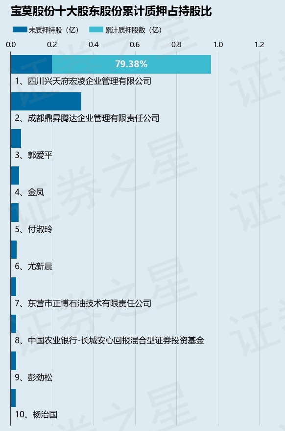 截止本公告日,股东四川兴天府宏凌企业管理有限公司已累计质押股份7676.0万股,占其持股总数的79.38%。本次质押后宝莫股份十大股东的累计质押股份占持股比例(占持股比例的计算以公司最新一期财务报表公布的十大股东的持股总数为基准)见下图: