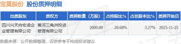 证券之星消息,宝莫股份(002476)11月28日公开信息显示,股东四川兴天府宏凌企业管理有限公司向黄河三角洲投资管理有限公司合计质押2000.0万股,占总股本3.27%。质押详情见下表: