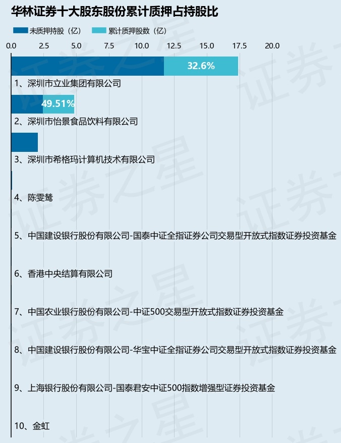 截止本公告日,股东深圳市立业集团有限公司已累计质押股份5.67亿股,占其持股总数的32.6%,股东深圳市怡景食品饮料有限公司已累计质押股份2.4亿股,占其持股总数的49.51%。本次质押后华林证券十大股东的累计质押股份占持股比例(占持股比例的计算以公司最新一期财务报表公布的十大股东的持股总数为基准)见下图: