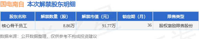 证券之星消息,根据市场公开信息整理,国电南自(600268)于11月28日将有8.86万股限售股份解禁,为公司股权激励限售股份,占公司总股本0.01%。(本次数据根据历史公告整理得出,实际情况以上市公司最新公告为准)最近一年内,该股累计解禁480.26万股,占总股本的0.47%。本次解禁后,公司还有503.94万股限售股份,占总股本0.5%。具体如下图所示:
