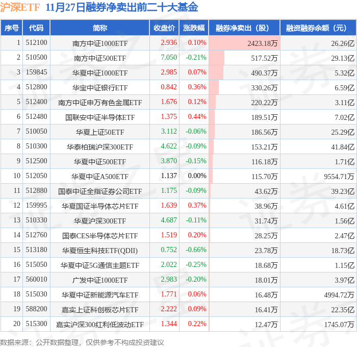 沪深ETF融券净卖出前三分别为:南方中证1000ETF(512100)融券净卖出2423.18万股、南方中证500ETF(510500)融券净卖出517.52万股、华夏中证1000ETF(159845)融券净卖出490.37万股,前20具体见下表: