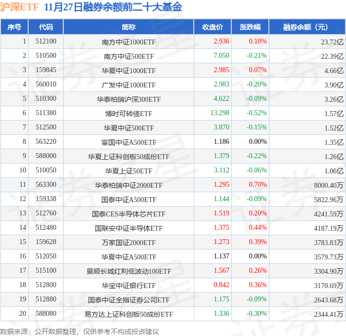 沪深ETF融券余额前三分别为:南方中证1000ETF(512100)融券余额23.72亿元、南方中证500ETF(510500)融券余额22.39亿元、华夏中证1000ETF(159845)融券余额4.66亿元,前20具体见下表: