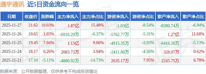证券之星消息,截至2025年11月27日收盘,通宇通讯(002792)报收于21.62元,上涨10.03%,涨停,换手率17.29%,成交量57.63万手,成交额12.07亿元。