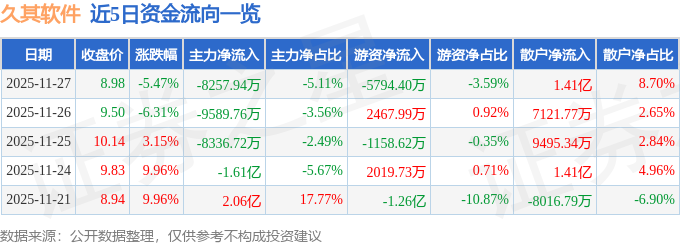 11月27日的资金流向数据方面,主力资金净流出8257.94万元,占总成交额5.11%,游资资金净流出5794.4万元,占总成交额3.59%,散户资金净流入1.41亿元,占总成交额8.7%。