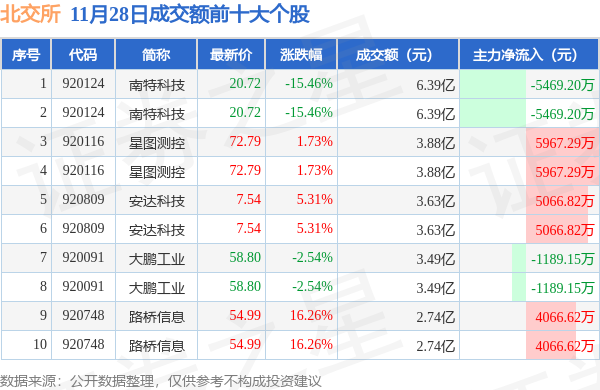 当日北交所成交额前10大个股中6只个股收涨,平均涨幅7.77%,其中南特科技(920124)以成交额6.39亿元排第一。从主力资金流入看,成交额前10大个股中有6只个股呈现主力资金净流入。