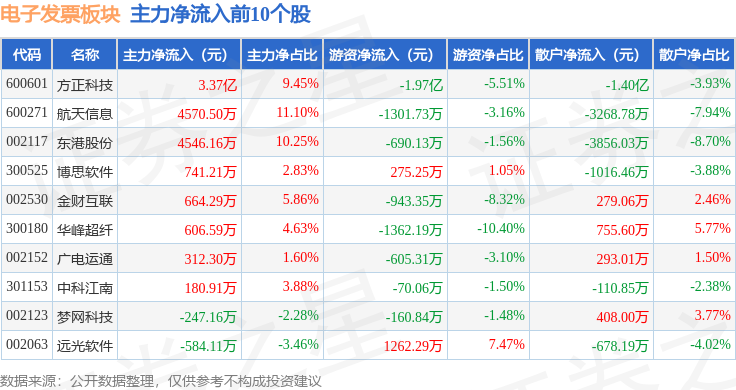 从资金流向上来看,当日电子发票板块主力资金净流入1.71亿元,游资资金净流出1.72亿元,散户资金净流入152.13万元。电子发票板块个股资金流向见下表: