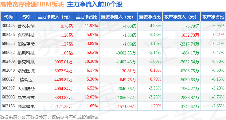从资金流向上来看,当日高带宽存储器HBM板块主力资金净流入13.64亿元,游资资金净流出7.35亿元,散户资金净流出6.28亿元。高带宽存储器HBM板块个股资金流向见下表: