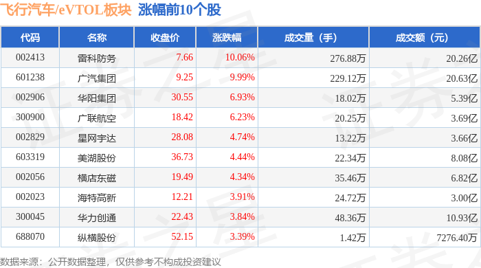 从资金流向上来看,当日飞行汽车/eVTOL板块主力资金净流入2.81亿元,游资资金净流出4.43亿元,散户资金净流入1.62亿元。飞行汽车/eVTOL板块个股资金流向见下表: