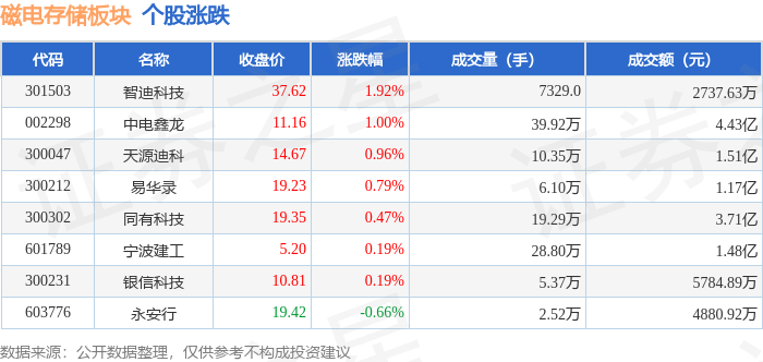 从资金流向上来看,当日磁电存储板块主力资金净流出6680.01万元,游资资金净流入220.22万元,散户资金净流入6459.79万元。磁电存储板块个股资金流向见下表: