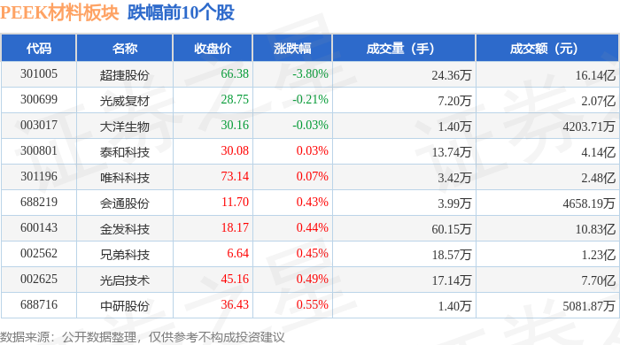 从资金流向上来看,当日PEEK材料板块主力资金净流入1.27亿元,游资资金净流入4333.4万元,散户资金净流出1.71亿元。PEEK材料板块个股资金流向见下表: