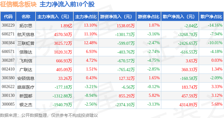 从资金流向上来看,当日征信概念板块主力资金净流入9622.28万元,游资资金净流出1533.35万元,散户资金净流出8088.92万元。征信概念板块个股资金流向见下表: