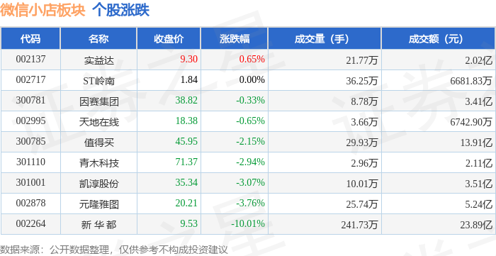 证券之星消息,11月28日微信小店板块较上一交易日下跌3.2%,新 华 都领跌。当日上证指数报收于3888.6,上涨0.34%。深证成指报收于12984.08,上涨0.85%。微信小店板块个股涨跌见下表: