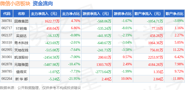 从资金流向上来看,当日微信小店板块主力资金净流出7.0亿元,游资资金净流入2.03亿元,散户资金净流入4.96亿元。微信小店板块个股资金流向见下表: