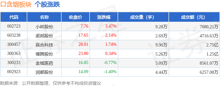 证券之星消息,11月28日口含烟板块较上一交易日上涨0.88%,小崧股份领涨。当日上证指数报收于3888.6,上涨0.34%。深证成指报收于12984.08,上涨0.85%。口含烟板块个股涨跌见下表: