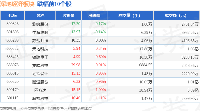 从资金流向上来看,当日深地经济板块主力资金净流入1.7亿元,游资资金净流入2205.06万元,散户资金净流出1.92亿元。深地经济板块个股资金流向见下表: