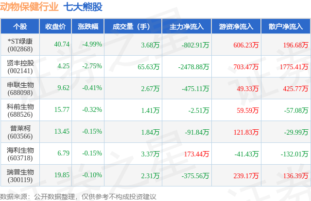 个股表现方面,动物保健行业当日领跌股为*ST绿康(002868),该股当日报收40.74,下跌4.99%,成交量3.68万,主力资金净流出802.91万元。贤丰控股(002141)以下跌2.75%紧随其后,该股当日成交量65.63万,主力资金净流出2478.88万元。除此之外,申联生物(688098)、科前生物(688526)、普莱柯(603566)均进入当日熊股之列。具体个股列表见下表: