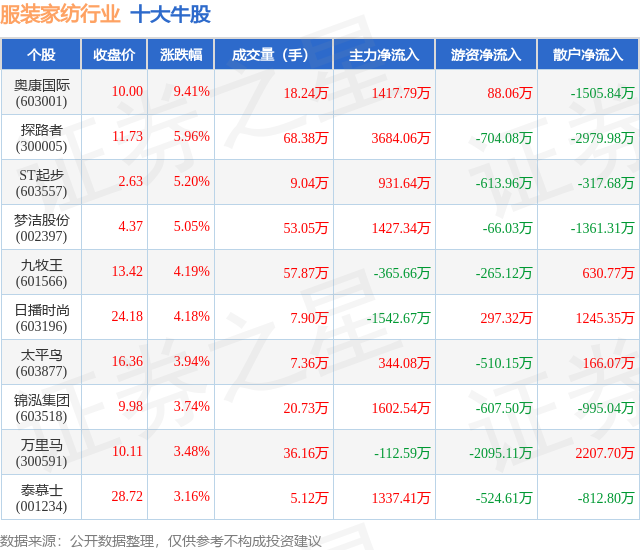 个股表现方面,服装家纺行业当日领涨股为奥康国际(603001),该股当日报收10.0,上涨9.41%,成交量18.24万,主力资金净流入1417.79万元。探路者(300005)以上涨5.96%紧随其后,该股当日成交量68.38万,主力资金净流入3684.06万元。除此之外,ST起步(603557)、梦洁股份(002397)、九牧王(601566)均进入当日牛股之列。具体个股列表见下表: