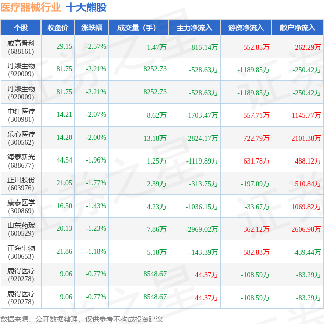 个股表现方面,医疗器械行业当日领跌股为威高骨科(688161),该股当日报收29.15,下跌2.57%,成交量1.47万,主力资金净流出815.14万元。丹娜生物(920009)以下跌2.21%紧随其后,该股当日成交量8253.0,主力资金净流出528.63万元。除此之外,丹娜生物(920009)、中红医疗(300981)、乐心医疗(300562)均进入当日熊股之列。具体个股列表见下表: