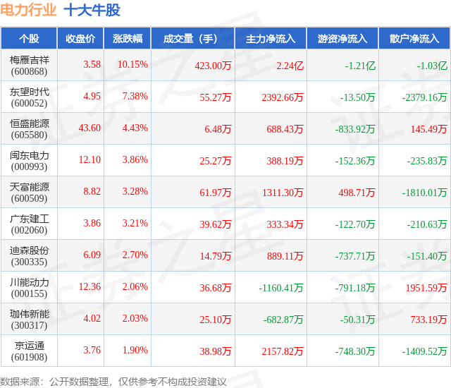 个股表现方面,电力行业当日领涨股为梅雁吉祥(600868),该股当日报收3.58,上涨10.15%,成交量423.0万,主力资金净流入2.24亿元。东望时代(600052)以上涨7.38%紧随其后,该股当日成交量55.27万,主力资金净流入2392.66万元。除此之外,恒盛能源(605580)、闽东电力(000993)、天富能源(600509)均进入当日牛股之列。具体个股列表见下表: