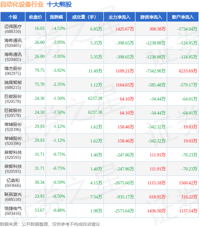 个股表现方面,自动化设备行业当日领跌股为迈得医疗(688310),该股当日报收16.03,下跌4.53%,成交量6.85万,主力资金净流入1425.67万元。海希通讯(920405)以下跌3.95%紧随其后,该股当日成交量5.35万,主力资金净流出398.65万元。除此之外,海希通讯(920405)、博杰股份(002975)、瑞晟智能(688215)均进入当日熊股之列。具体个股列表见下表:
