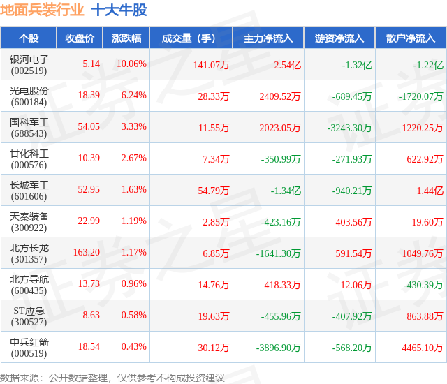 个股表现方面,地面兵装行业当日领涨股为银河电子(002519),该股当日报收5.14,上涨10.06%,成交量141.07万,主力资金净流入2.54亿元。光电股份(600184)以上涨6.24%紧随其后,该股当日成交量28.33万,主力资金净流入2409.52万元。除此之外,国科军工(688543)、甘化科工(000576)、长城军工(601606)均进入当日牛股之列。具体个股列表见下表:
