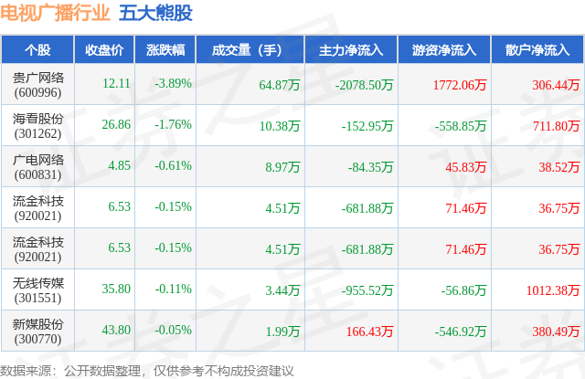 个股表现方面,电视广播行业当日领跌股为贵广网络(600996),该股当日报收12.11,下跌3.89%,成交量64.87万,主力资金净流出2078.5万元。海看股份(301262)以下跌1.76%紧随其后,该股当日成交量10.38万,主力资金净流出152.95万元。除此之外,广电网络(600831)、流金科技(920021)、流金科技(920021)均进入当日熊股之列。具体个股列表见下表: