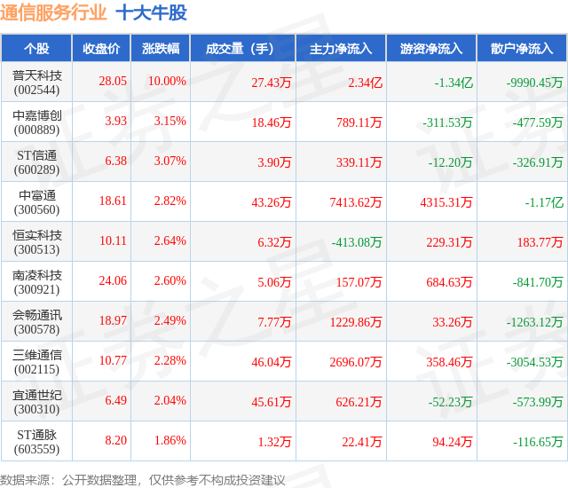 个股表现方面,通信服务行业当日领涨股为普天科技(002544),该股当日报收28.05,上涨10.0%,成交量27.43万,主力资金净流入2.34亿元。中嘉博创(000889)以上涨3.15%紧随其后,该股当日成交量18.46万,主力资金净流入789.11万元。除此之外,ST信通(600289)、中富通(300560)、恒实科技(300513)均进入当日牛股之列。具体个股列表见下表: