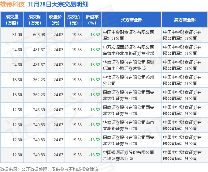 证券之星消息,11月28日雄帝科技发生大宗交易,交易数据如下: