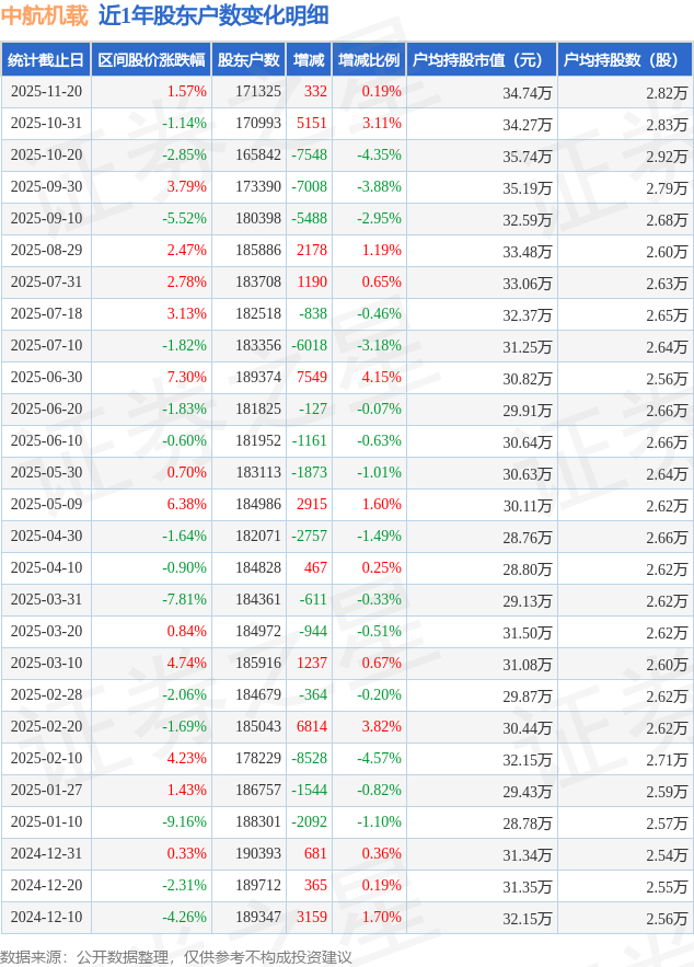 从股价来看,2025年10月31日至2025年11月20日,中航机载区间涨幅为1.57%,在此期间股东户数增加332.0户,增幅为0.19%。