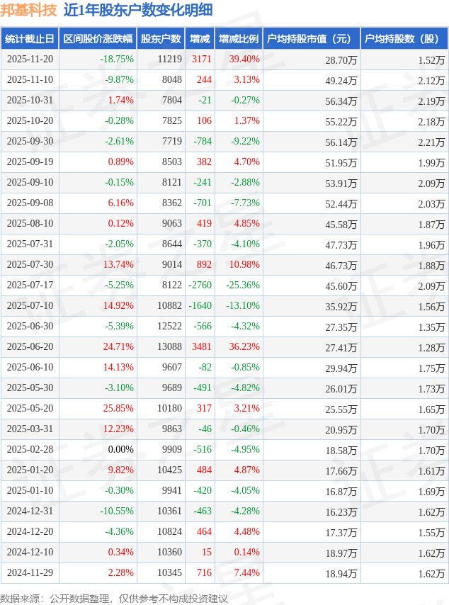 从股价来看,2025年11月10日至2025年11月20日,邦基科技区间跌幅为18.75%,在此期间股东户数增加3171.0户,增幅为39.4%。