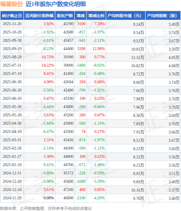 从股价来看,2025年10月20日至2025年11月20日,福星股份区间涨幅为3.92%,在此期间股东户数增加3100.0户,增幅为7.28%。