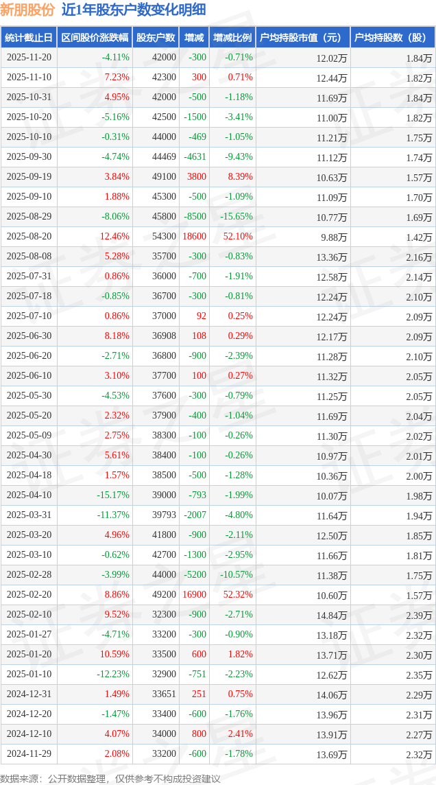 从股价来看,2025年11月10日至2025年11月20日,新朋股份区间跌幅为4.11%,在此期间股东户数减少300.0户,减幅为0.71%。
