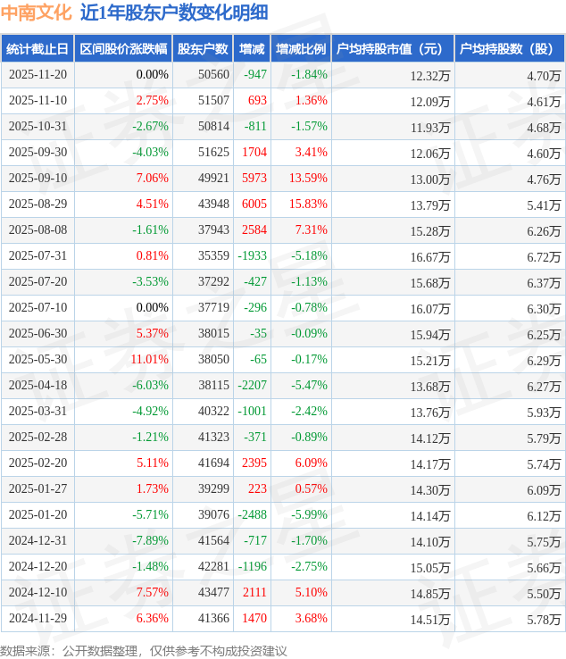 从股价来看,2025年11月10日至2025年11月20日,中南文化区间跌幅为0.0%,在此期间股东户数减少947.0户,减幅为1.84%。