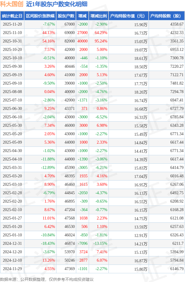 从股价来看,2025年11月10日至2025年11月20日,科大国创区间跌幅为7.67%,在此期间股东户数减少2000.0户,减幅为2.9%。
