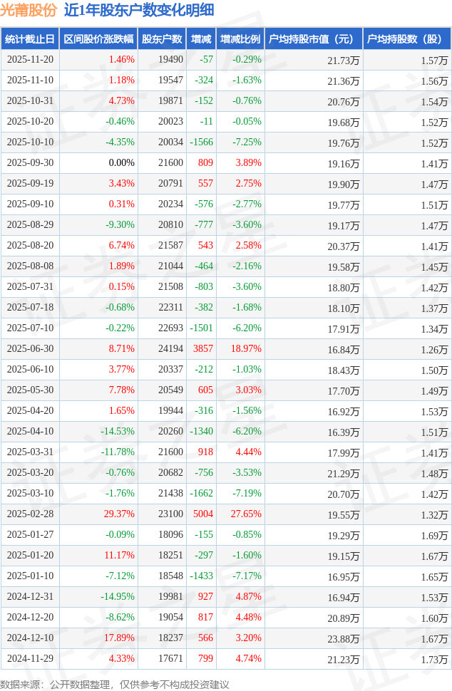从股价来看,2025年11月10日至2025年11月20日,光莆股份区间涨幅为1.46%,在此期间股东户数减少57.0户,减幅为0.29%。