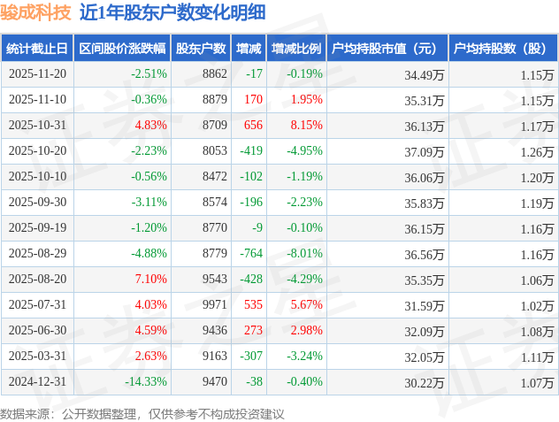 从股价来看,2025年11月10日至2025年11月20日,骏成科技区间跌幅为2.51%,在此期间股东户数减少17.0户,减幅为0.19%。