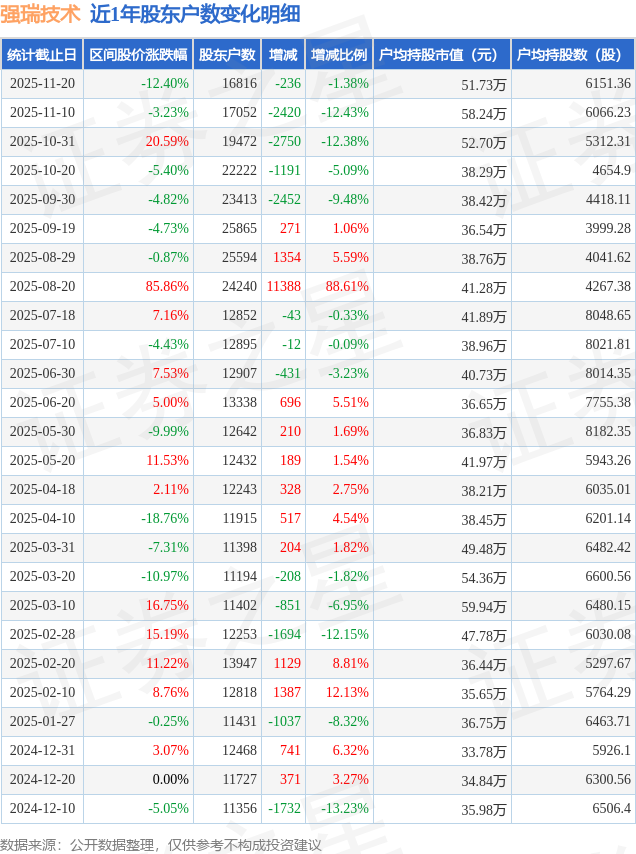 从股价来看,2025年11月10日至2025年11月20日,强瑞技术区间跌幅为12.4%,在此期间股东户数减少236.0户,减幅为1.38%。